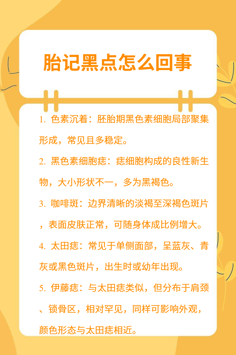 1. 色素沉着:通常是由于皮肤在胚胎发育过程中,黑色素细胞分布不均匀,局部黑色素细胞聚集增多,从而形成胎记黑点。这种情况较为常见,一般对健康无明显影响,多数会随着年龄增长而逐渐稳定,不会有太大变化。
