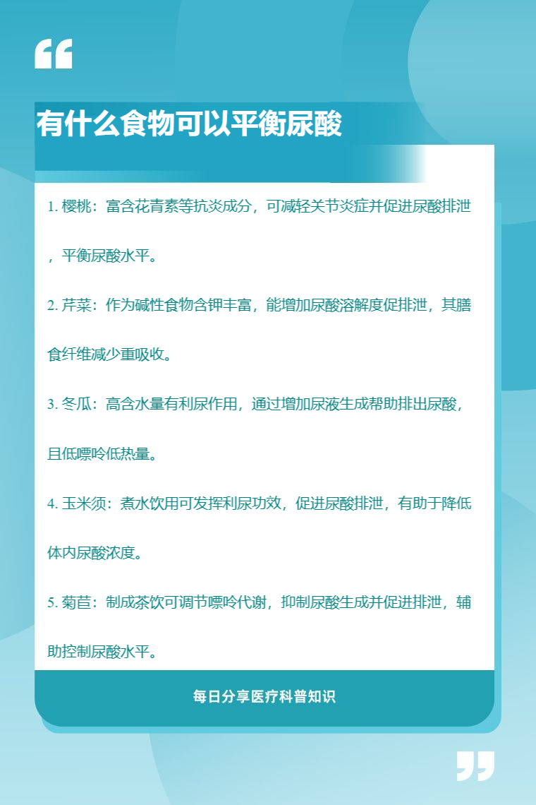 在日常生活中,除了适当食用这些有助于平衡尿酸的食物,还应注意保持均衡饮食,控制高嘌呤食物摄入,如动物内脏、海鲜等,同时要多饮水,促进尿酸排泄。适当运动、控制体重、规律作息对维持尿酸平衡也十分重要。若尿酸问题严重,务必及时就医,遵循医生建议进行治疗和饮食调整 。