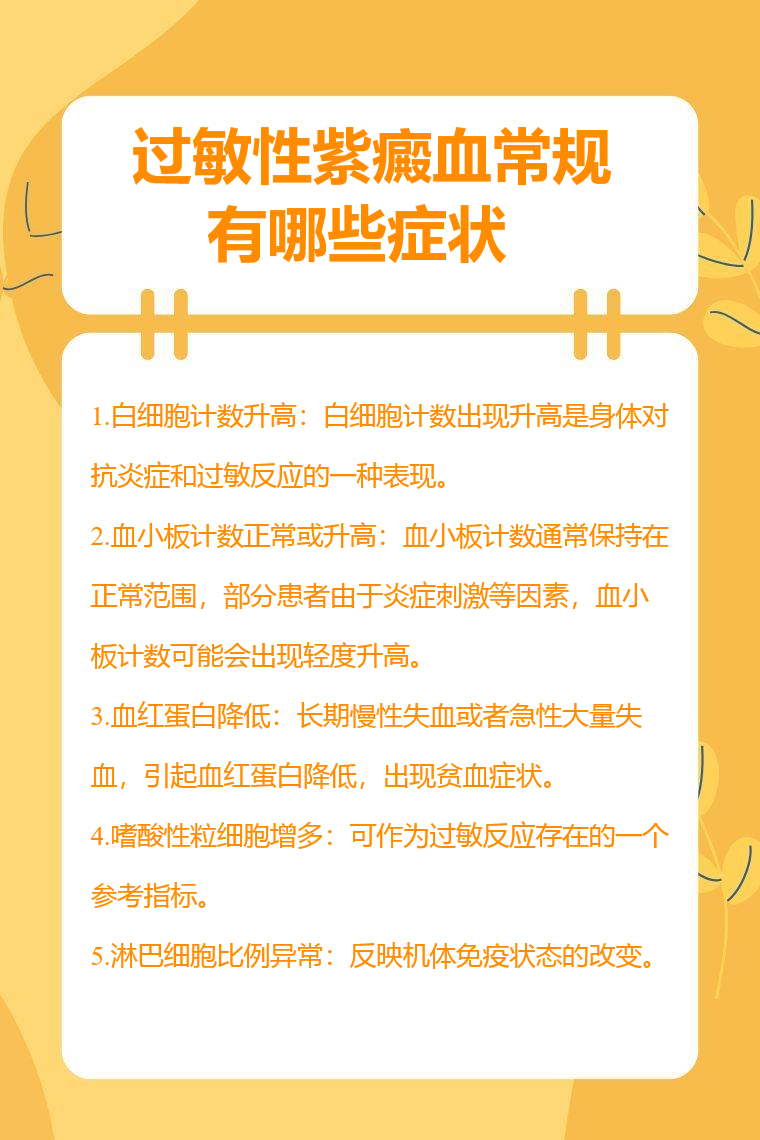 过敏性紫癜患者血常规可能出现白细胞计数升高、血小板计数正常或升高、血红蛋白降低、嗜酸性粒细胞增多、淋巴细胞比例异常等。