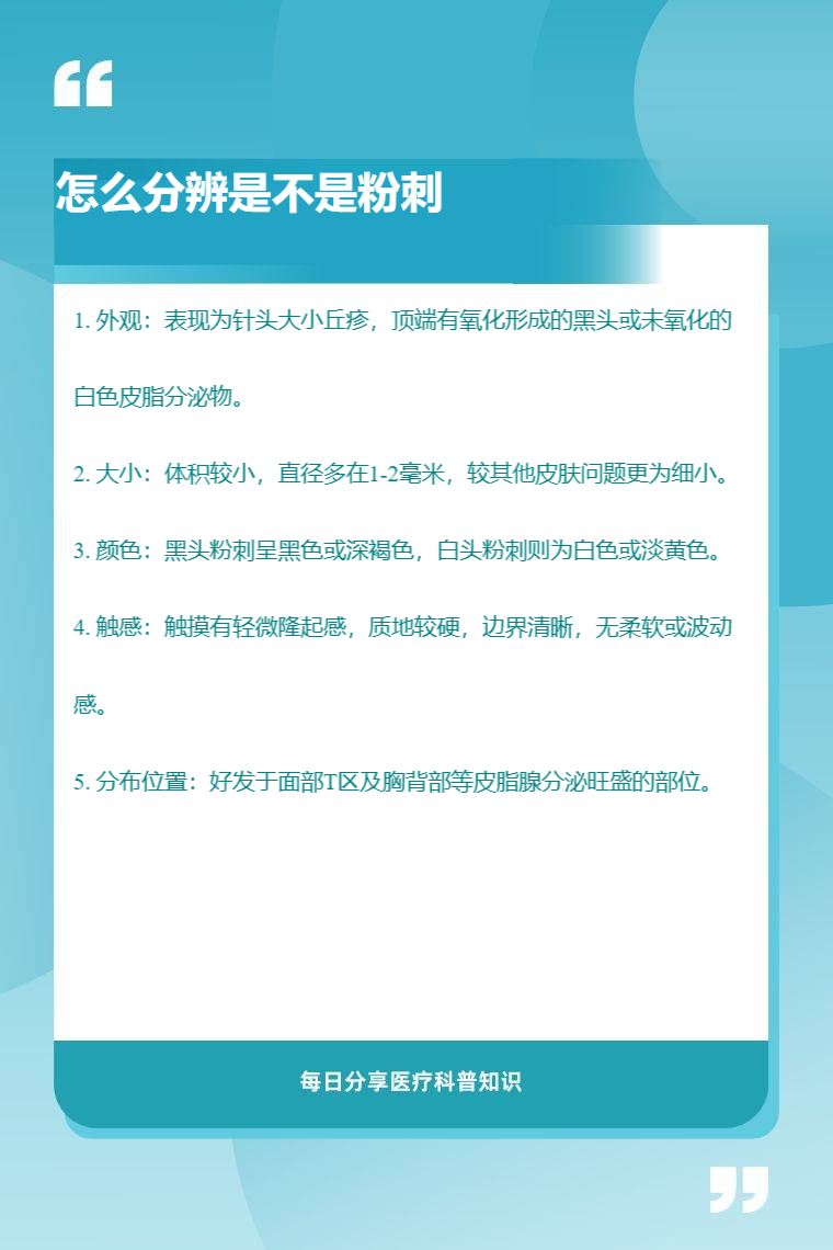 5. 分布位置:粉刺好发于皮脂腺丰富的部位,如面部的T区额头、鼻子、下巴,这些部位皮脂腺分泌旺盛,容易出现油脂分泌过多堵塞毛囊的情况,胸部、背部等皮脂腺分布较多的区域也可能出现。