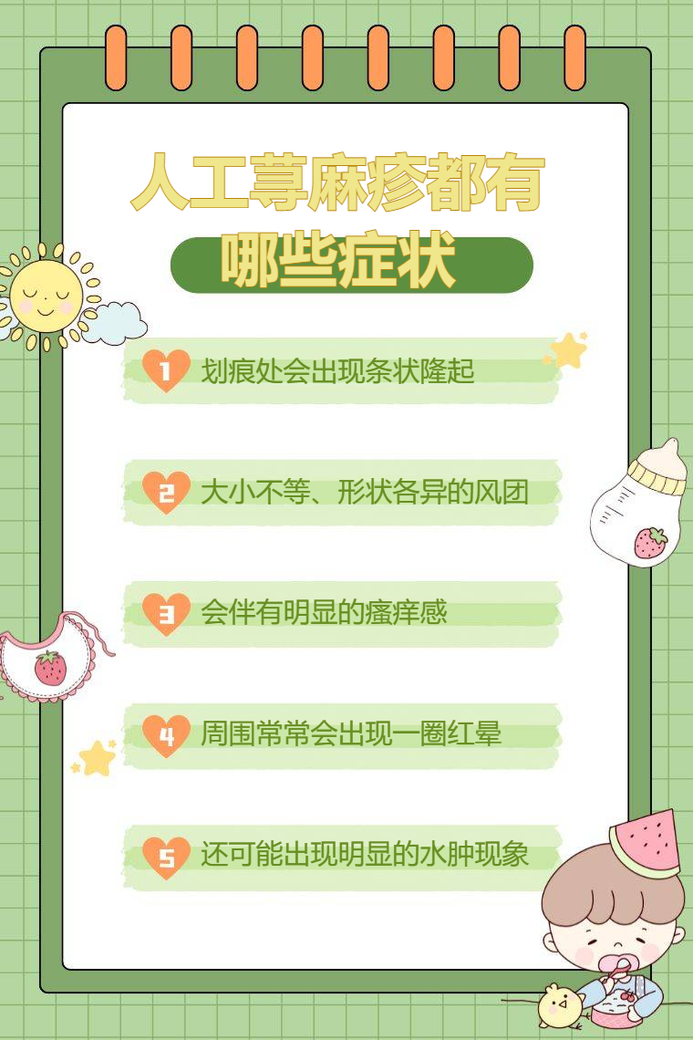 1. 皮肤划痕症:用钝器在皮肤上适度用力划过后,数分钟内划痕处会出现条状隆起,类似蚊虫叮咬后的痕迹,这是人工荨麻疹较为典型的症状表现。