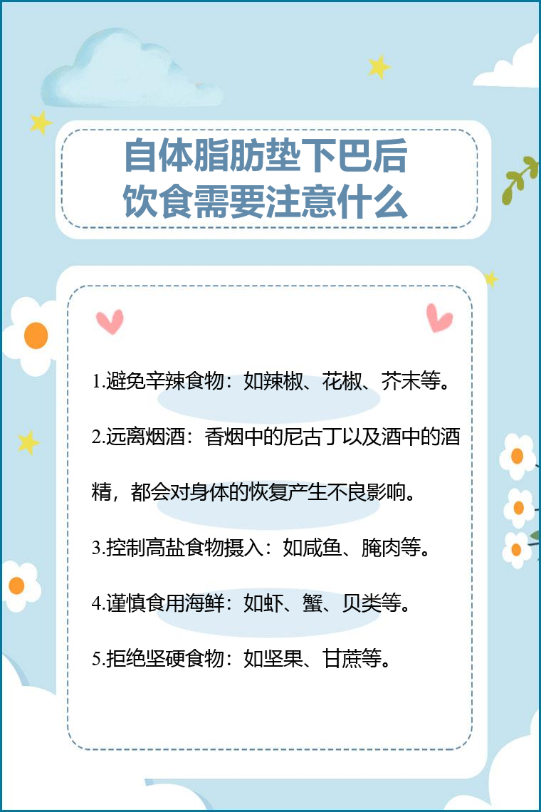 自体脂肪垫下巴后饮食需注意避免辛辣食物、远离烟酒、控制高盐食物摄入、谨慎食用海鲜、拒绝坚硬食物等。