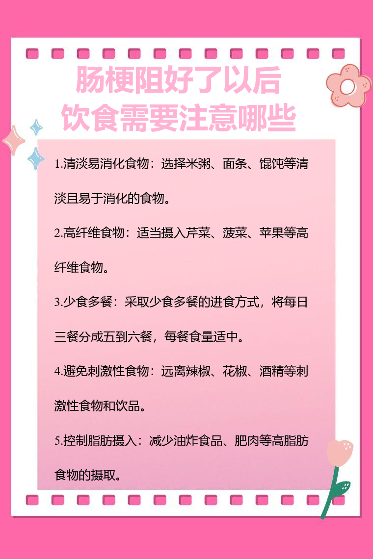 肠梗阻好了以后饮食需要注意清淡易消化食物、高纤维食物、少食多餐、避免刺激性食物、控制脂肪摄入等。