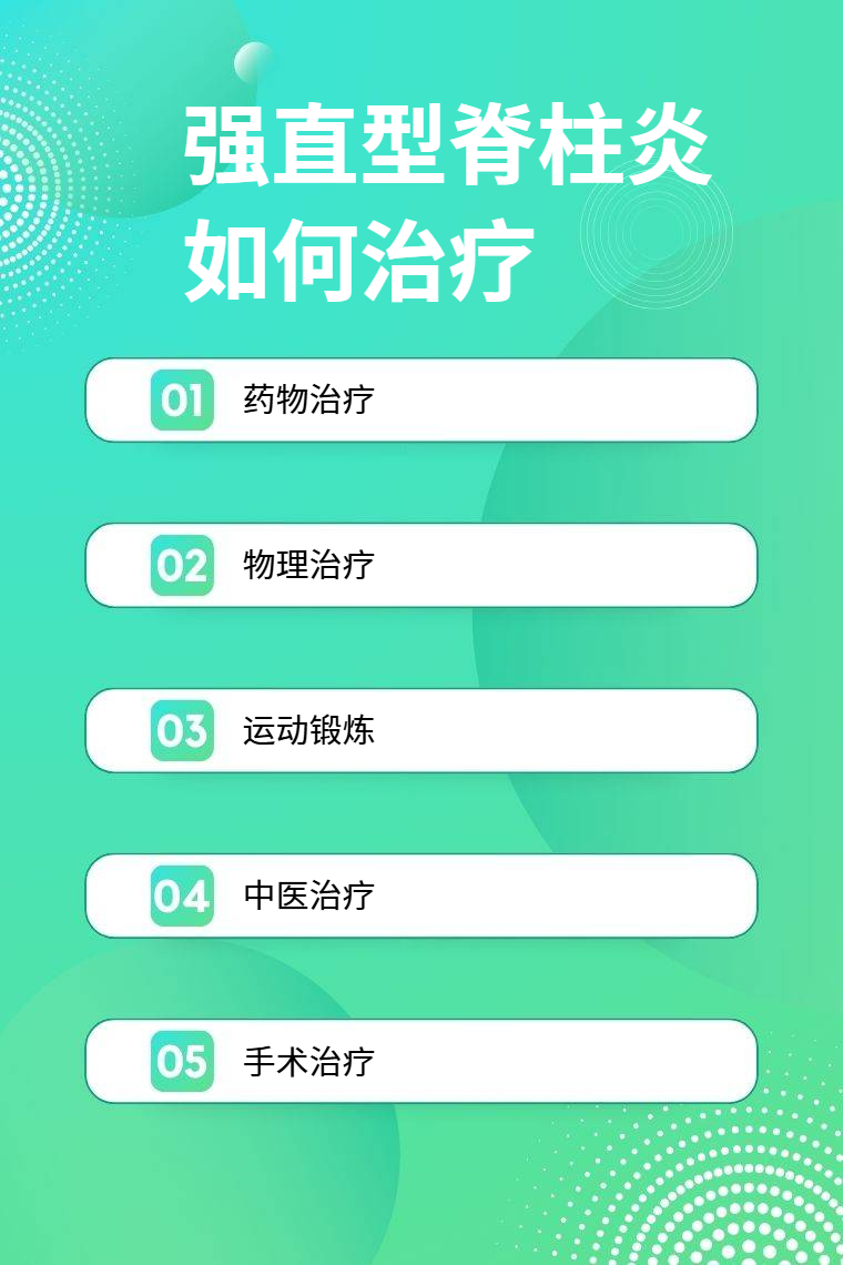 强直型脊柱炎的治疗方法包括药物治疗、物理治疗、运动锻炼、中医治疗、手术治疗等。