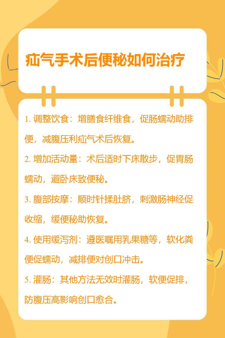 疝气手术后便秘可通过调整饮食、增加活动量、腹部按摩、使用缓泻剂、灌肠等方法治疗。
