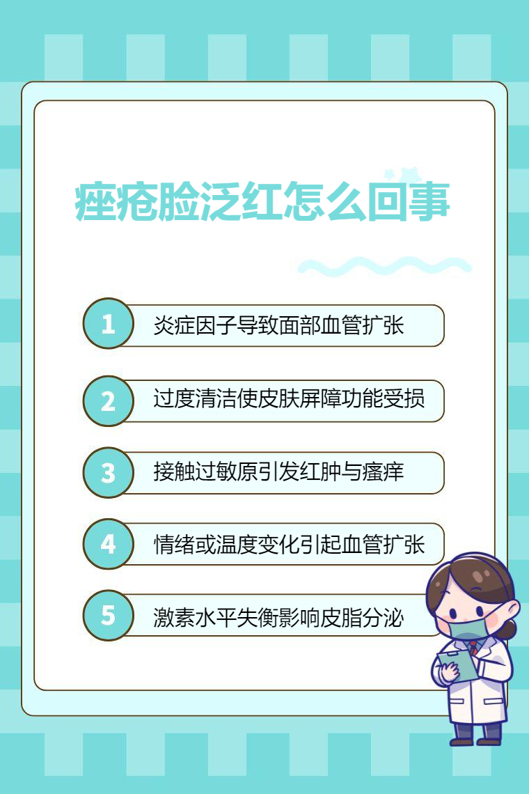1. 炎症刺激:痤疮本身是一种毛囊皮脂腺的慢性炎症性皮肤病,炎症因子会刺激皮肤血管,使其扩张,进而导致脸部泛红。炎症越严重,泛红现象可能越明显,且常伴有痤疮部位的红肿、疼痛等症状。