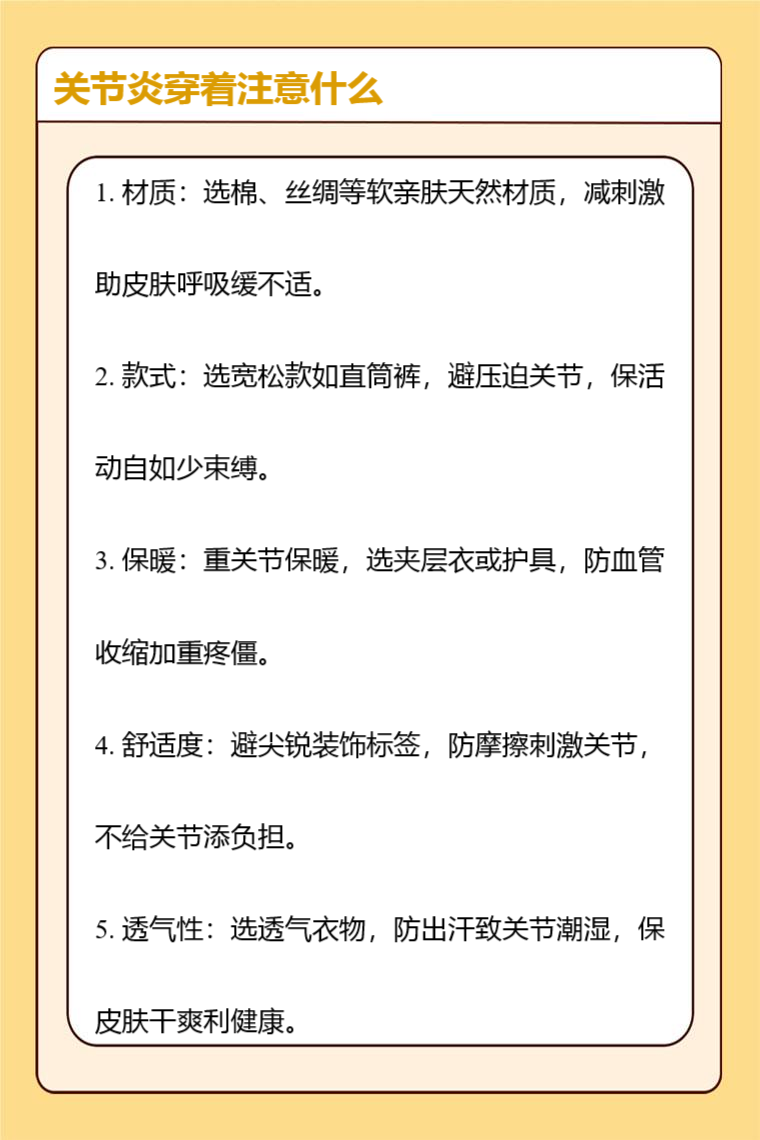 日常还需根据天气变化及时调整穿着,注意关节部位的保护。若关节炎症状严重,务必遵循医生的建议,积极配合治疗,通过正确的穿着和其他护理措施,缓解症状,提高生活质量 。