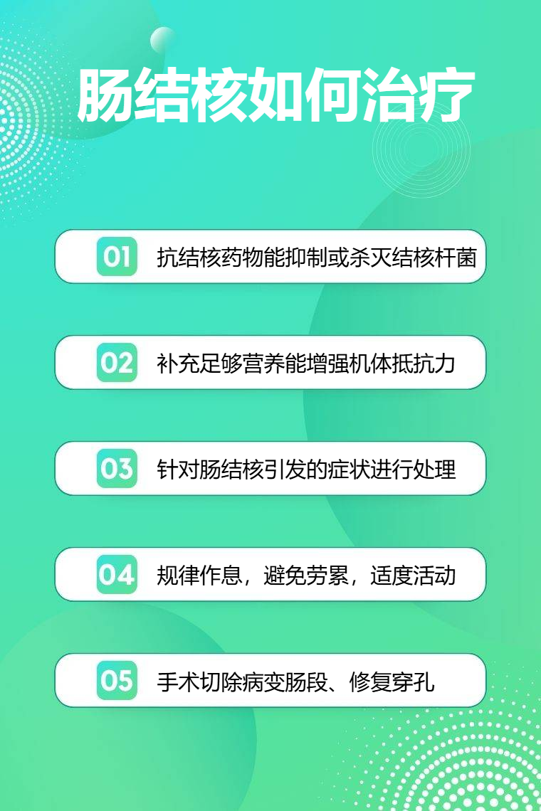 肠结核的治疗方法主要有抗结核药物治疗、营养支持治疗、对症治疗、休息与康复治疗、手术治疗等。