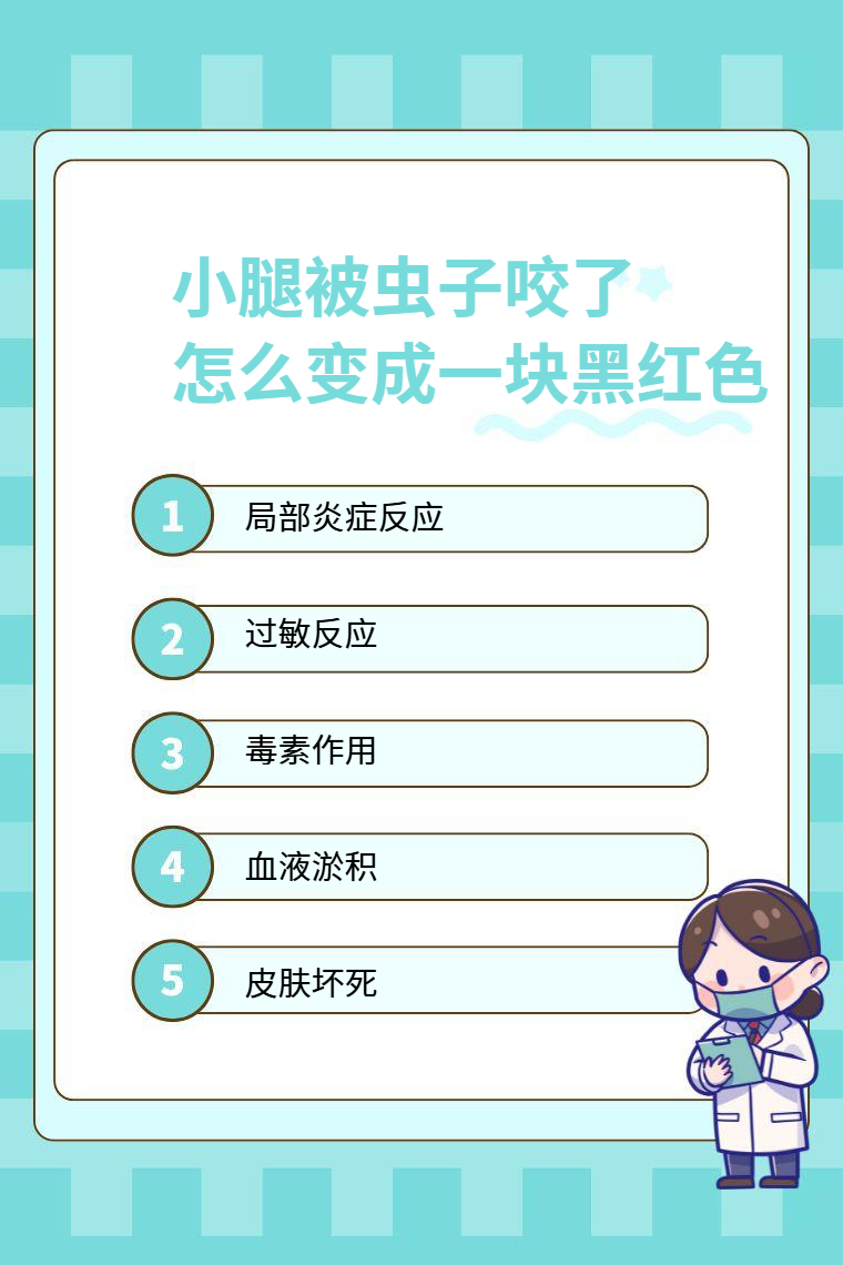 小腿被虫子咬后变成黑红色可能是由于局部炎症反应、过敏反应、毒素作用、血液淤积、皮肤坏死等。