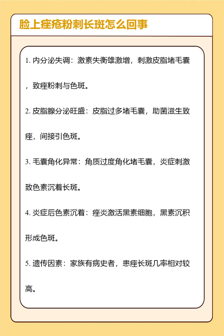 脸上痤疮粉刺长斑常见原因有内分泌失调、皮脂腺分泌旺盛、毛囊角化异常、炎症后色素沉着、遗传因素等。