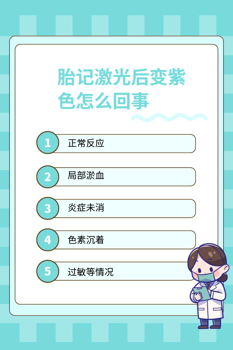 4. 色素沉着:激光治疗后,皮肤的黑色素细胞可能受到刺激,导致黑色素异常分泌和沉着,使得胎记部位颜色变紫。这与个人体质、术后防晒等因素有关,可在医生指导下采取相应措施改善。