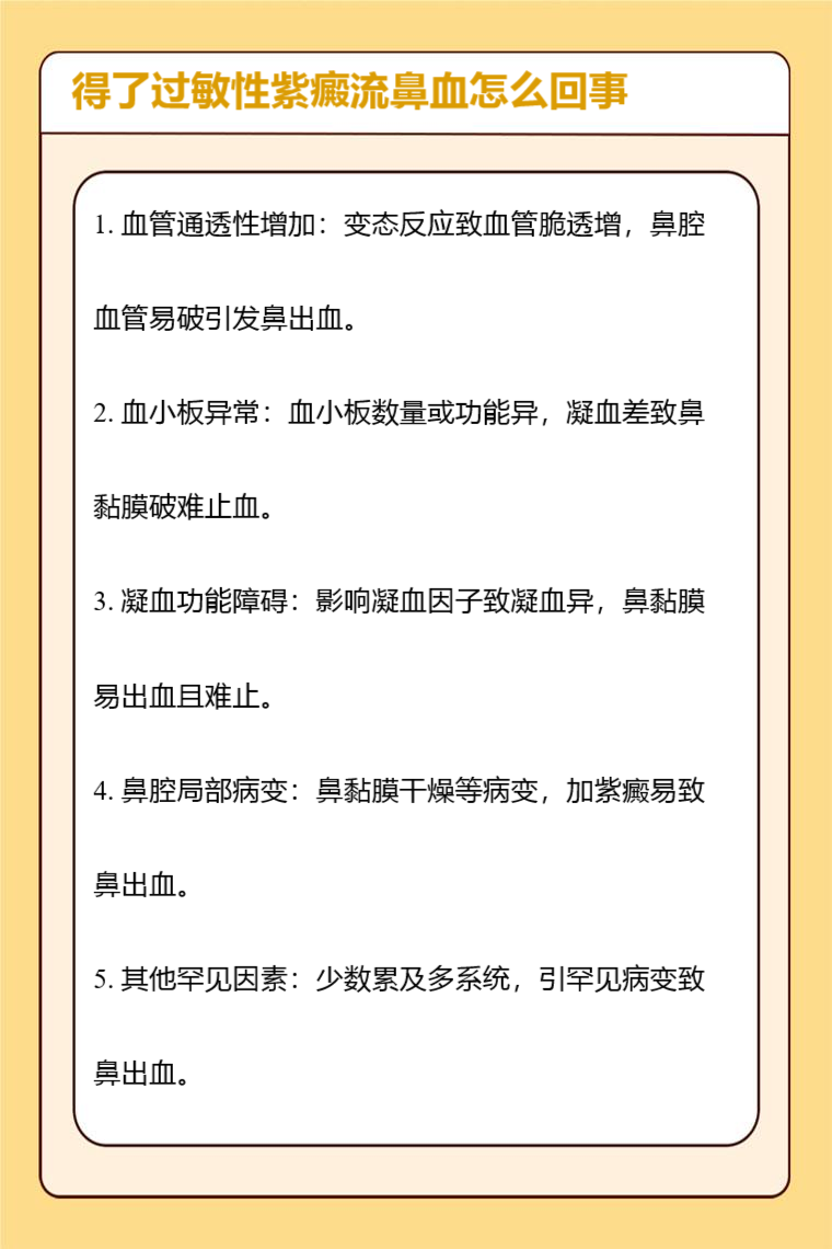5. 其他罕见因素:少数情况下,过敏性紫癜可能累及全身多个系统,引发一些罕见的病理变化,影响到鼻腔的正常生理功能,进而导致流鼻血。不过这种情况相对少见。