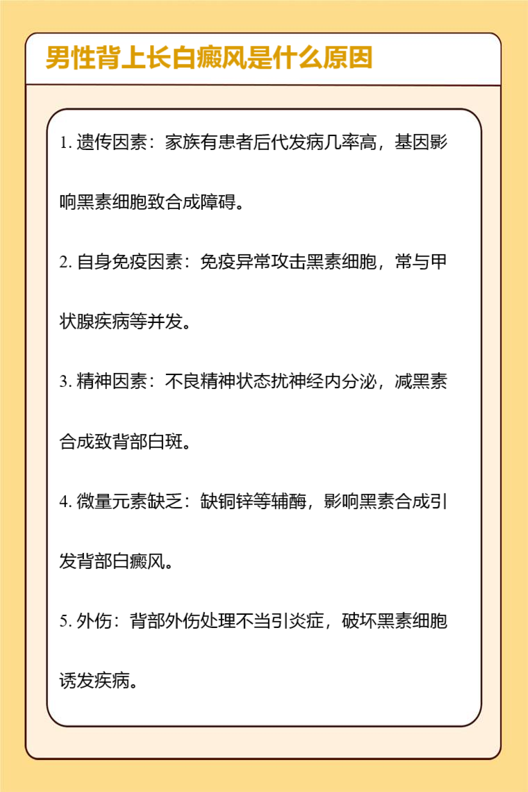 男性背上长白癜风的原因有遗传因素、自身免疫因素、精神因素、微量元素缺乏、外伤等。