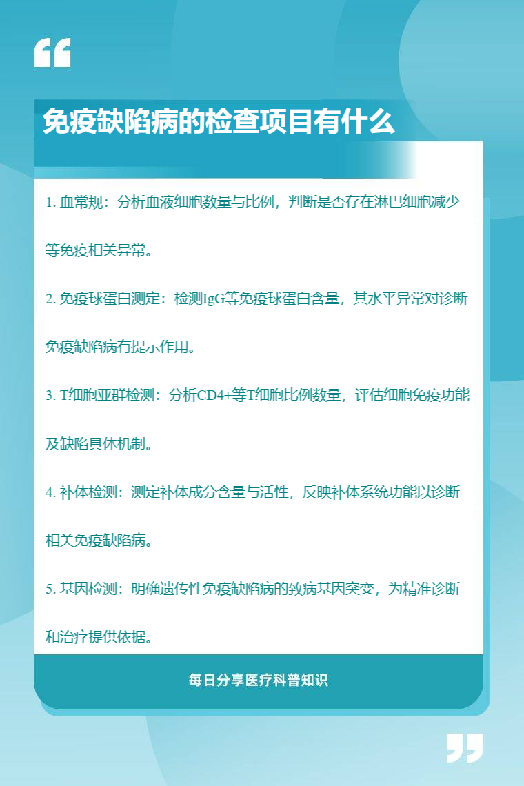 免疫缺陷病的检查项目有血常规、免疫球蛋白测定、T 细胞亚群检测、补体检测、基因检测等。
