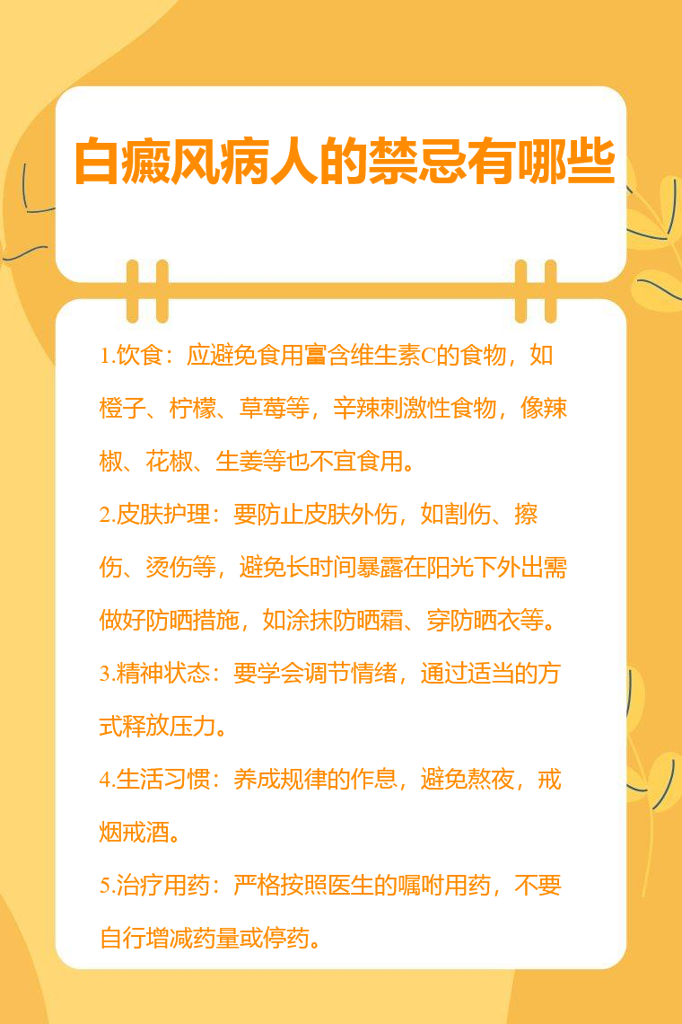 白癜风病人的禁忌有饮食、皮肤护理、精神状态、生活习惯、治疗用药等。