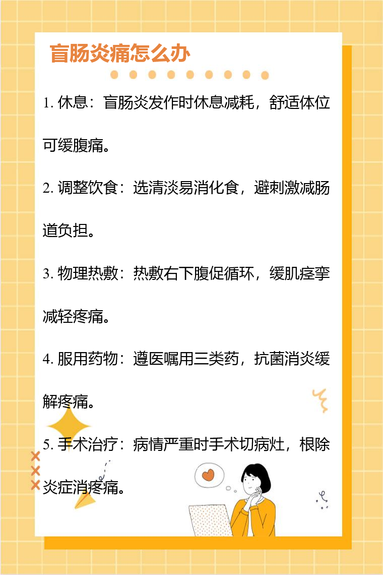 盲肠炎痛可以通过休息、调整饮食、物理热敷、服用药物、手术治疗等方法来缓解。