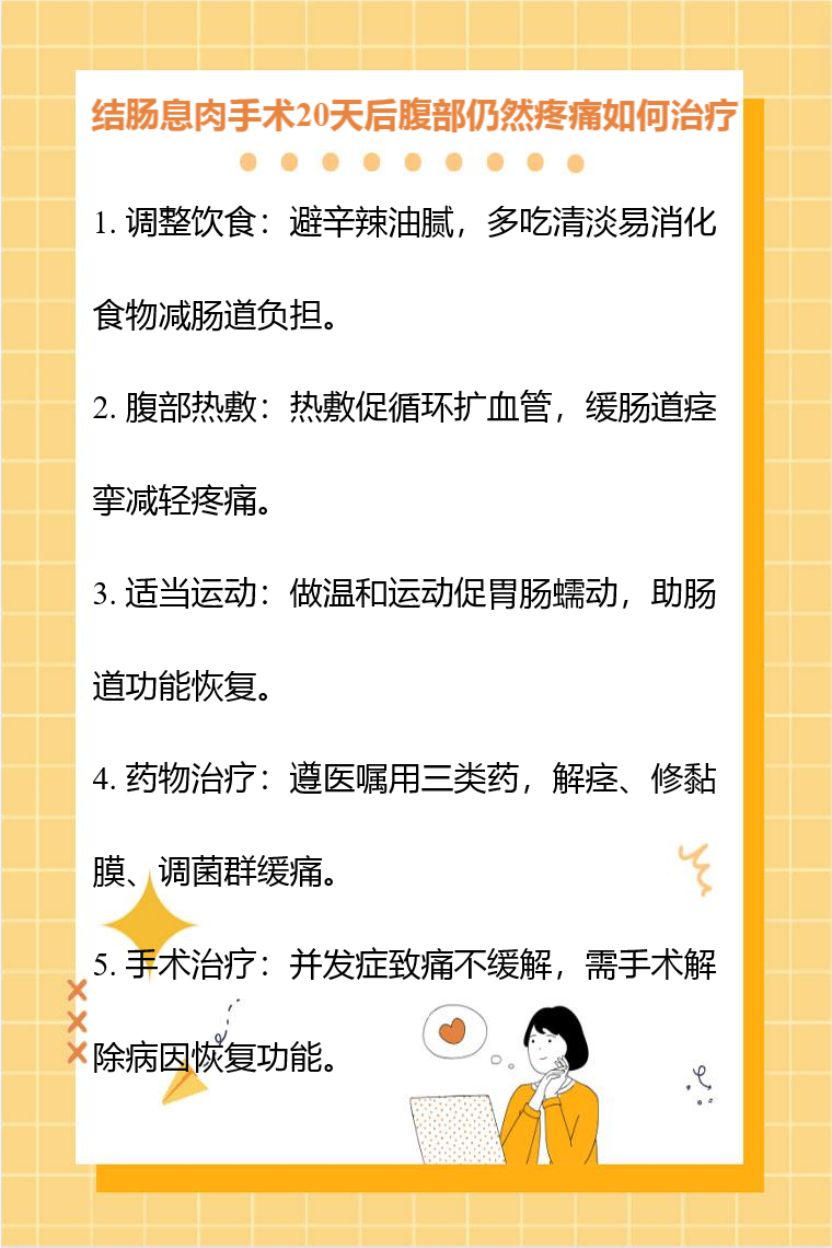 结肠息肉手术 20 天后腹部仍然疼痛可通过调整饮食、腹部热敷、适当运动、药物治疗、手术治疗等方法缓解。