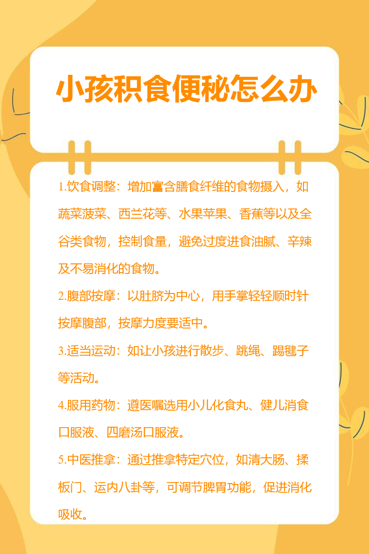 小孩积食便秘可通过饮食调整、腹部按摩、适当运动、服用药物、中医推拿等方法来解决。