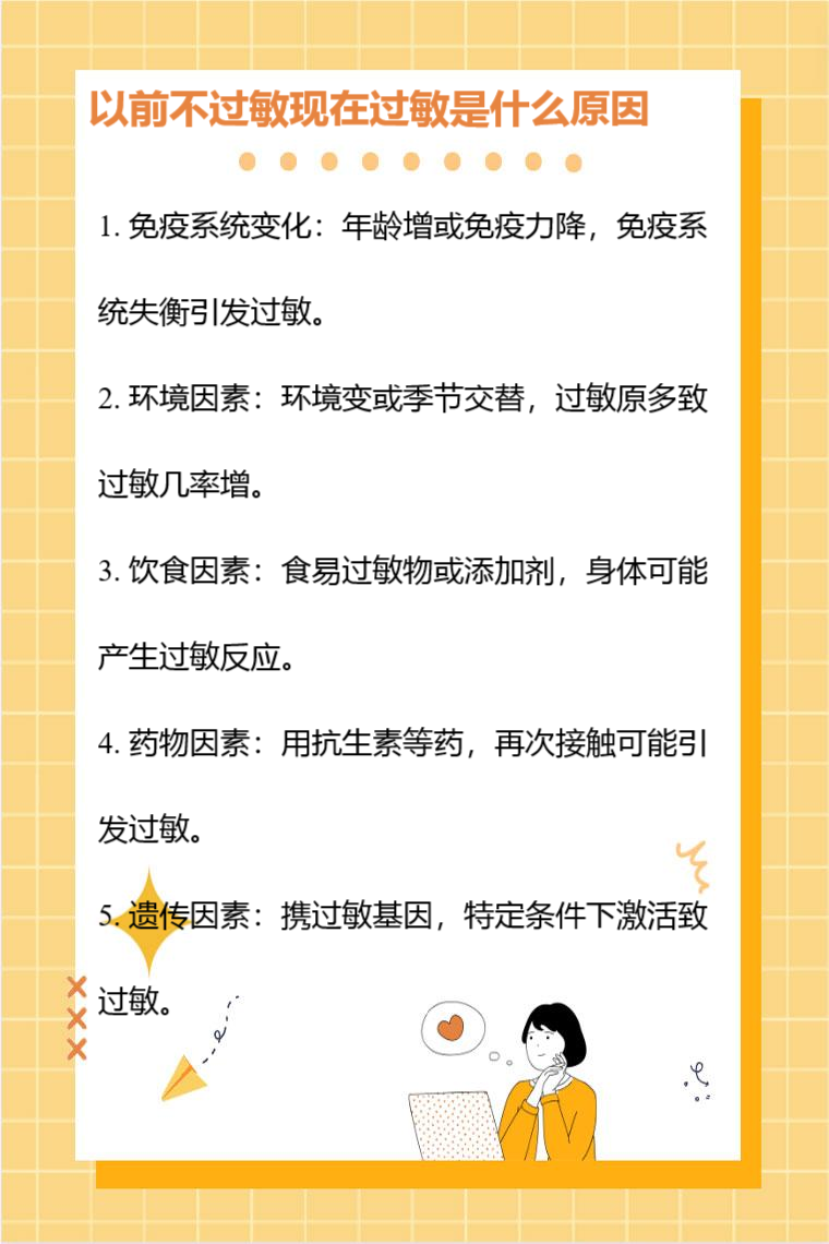 以前不过敏现在过敏的原因包括免疫系统变化、环境因素、饮食因素、药物因素、遗传因素等。