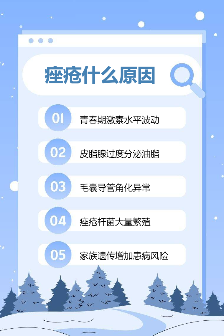 1. 内分泌失调:体内激素水平失衡,尤其是雄激素水平升高,会刺激皮脂腺增大、皮脂分泌增加,为痤疮的产生创造条件。青春期雄激素分泌旺盛,所以痤疮在青少年群体中较为多发。
