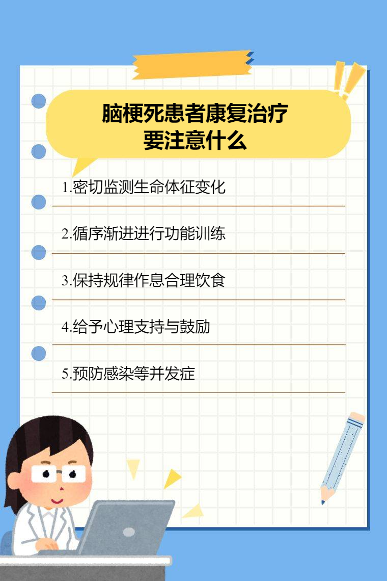 脑梗死患者康复治疗要注意病情监测、康复训练、日常生活管理、心理调节、并发症预防等。