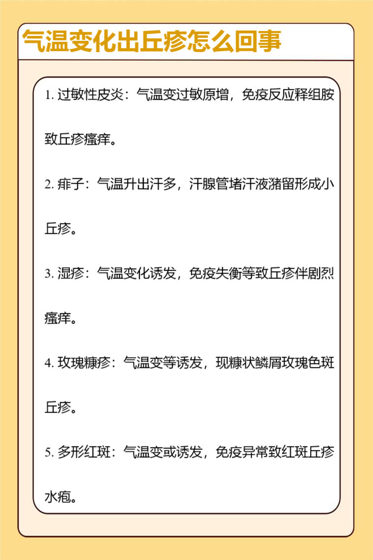 1. 过敏性皮炎:气温变化时,空气中的过敏原如花粉、尘螨等增多,皮肤接触或吸入后,免疫系统会将其识别为外来的有害物质,从而启动免疫反应。在这个过程中,身体会释放如组胺等化学物质,导致皮肤出现丘疹,还可能伴有瘙痒、红肿等症状。