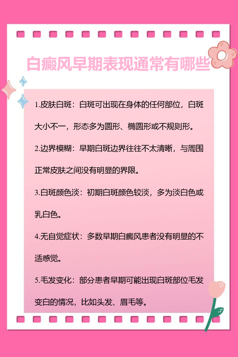 白癜风早期表现通常有皮肤白斑、边界模糊、白斑颜色淡、无自觉症状、毛发变化等。