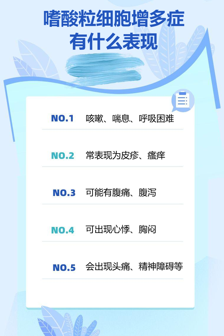 嗜酸粒细胞增多症的表现有呼吸系统症状、皮肤症状、消化系统症状、心血管系统症状、神经系统症状等。