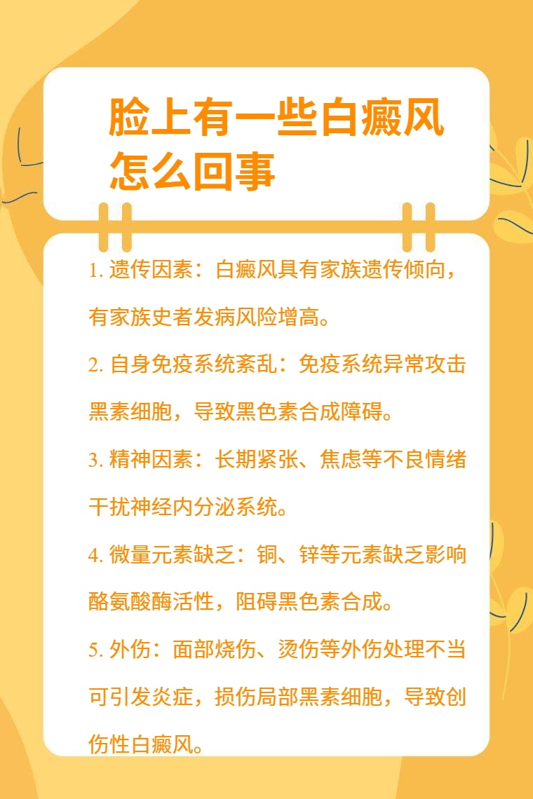脸上出现一些白癜风可能是遗传因素、自身免疫系统紊乱、精神因素、微量元素缺乏、外伤等情况导致。