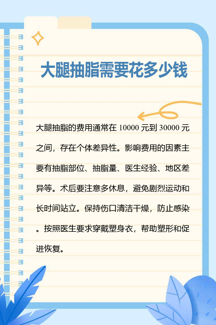 大腿抽脂的费用通常在 10000 元到 30000 元之间,存在个体差异性。影响费用的因素主要有抽脂部位、抽脂量、医生经验、地区差异等。