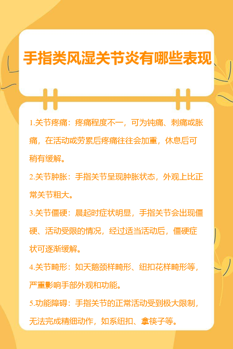 手指类风湿关节炎的表现有关节疼痛、肿胀、僵硬、畸形、功能障碍等。