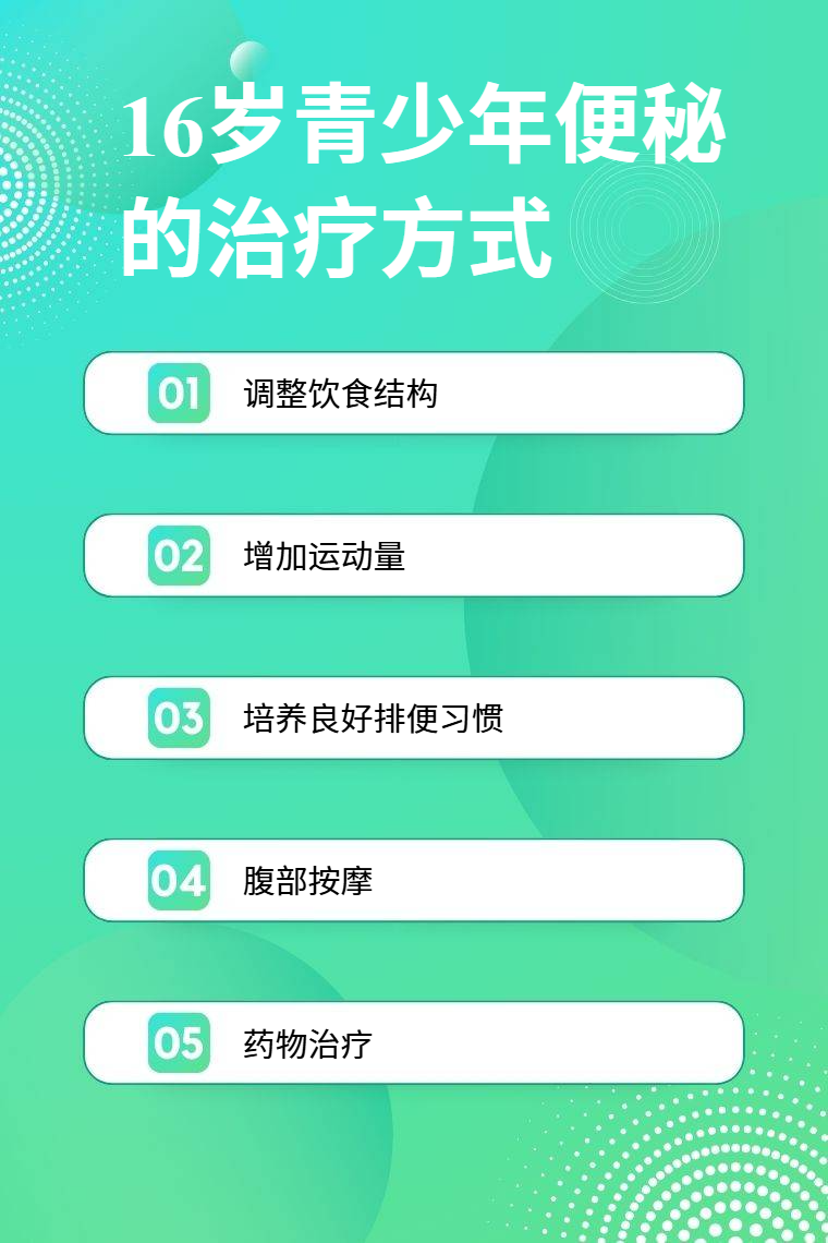 16 岁青少年便秘可通过调整饮食结构、增加运动量、培养良好排便习惯、腹部按摩、药物治疗等方式来缓解。