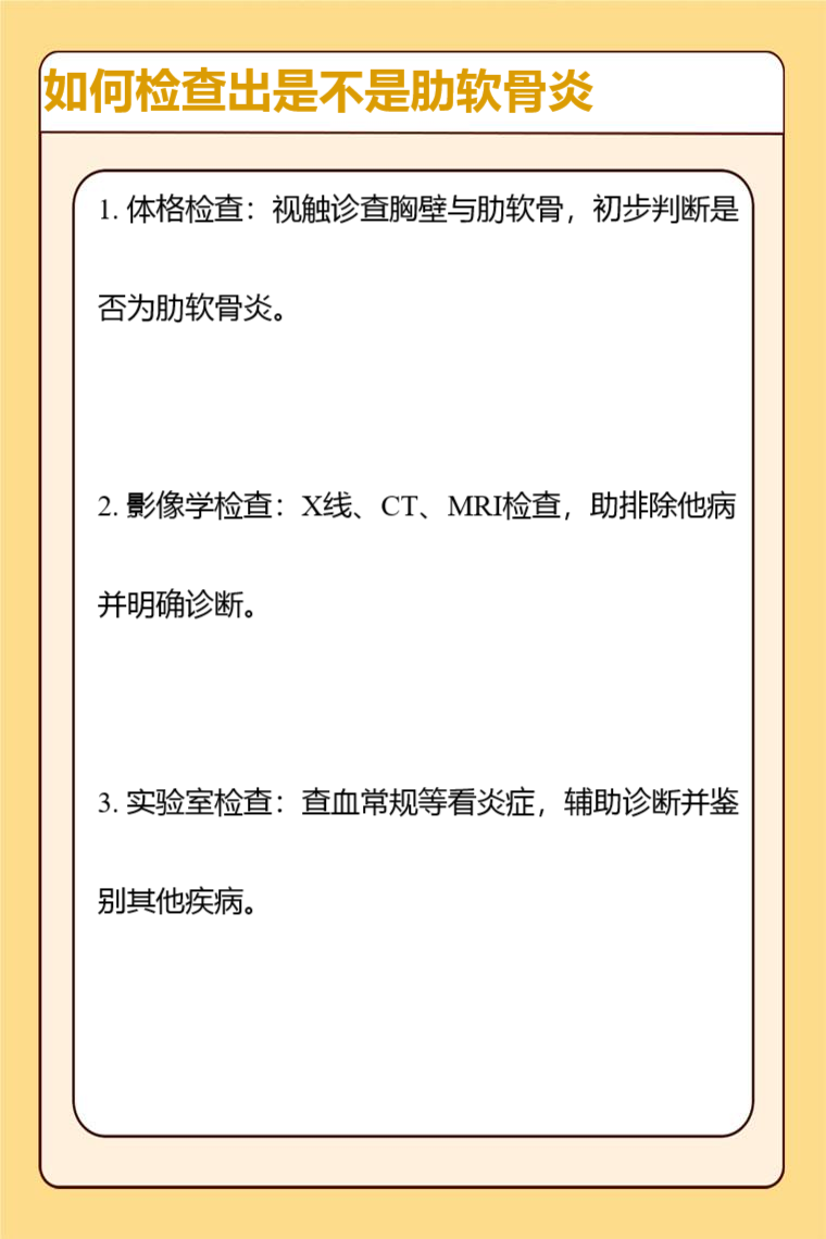 体格检查、影像学检查、实验室检查等可检查出是不是肋软骨炎。