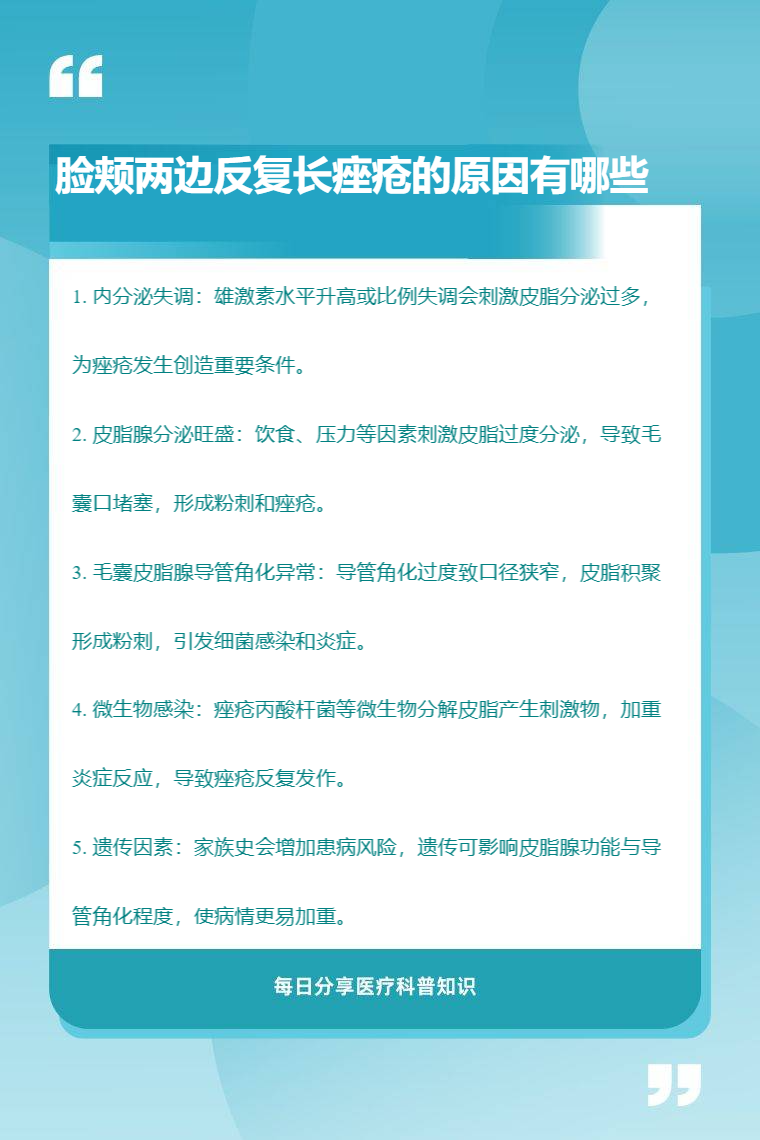 脸颊两边反复长痤疮的原因有内分泌失调、皮脂腺分泌旺盛、毛囊皮脂腺导管角化异常、微生物感染、遗传因素等。