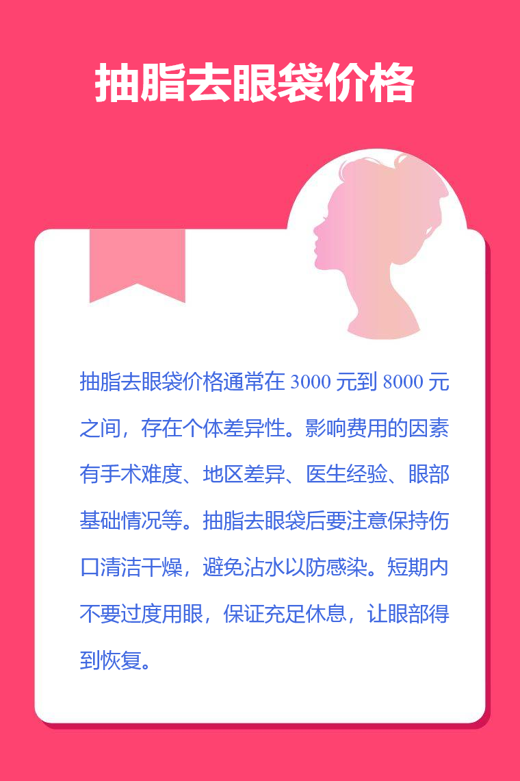 抽脂去眼袋价格通常在 3000 元到 8000 元之间,存在个体差异性。影响费用的因素有手术难度、地区差异、医生经验、眼部基础情况等。
