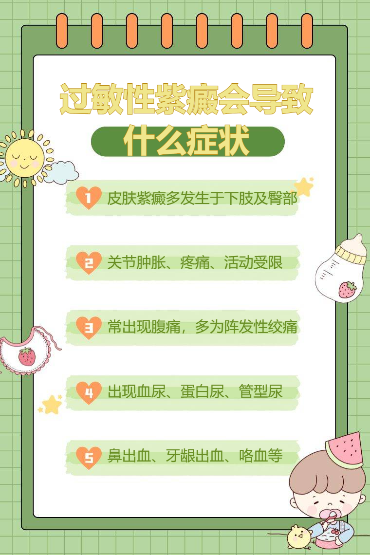 过敏性紫癜会导致皮肤紫癜、关节疼痛、胃肠道症状、肾脏症状、其他症状等。