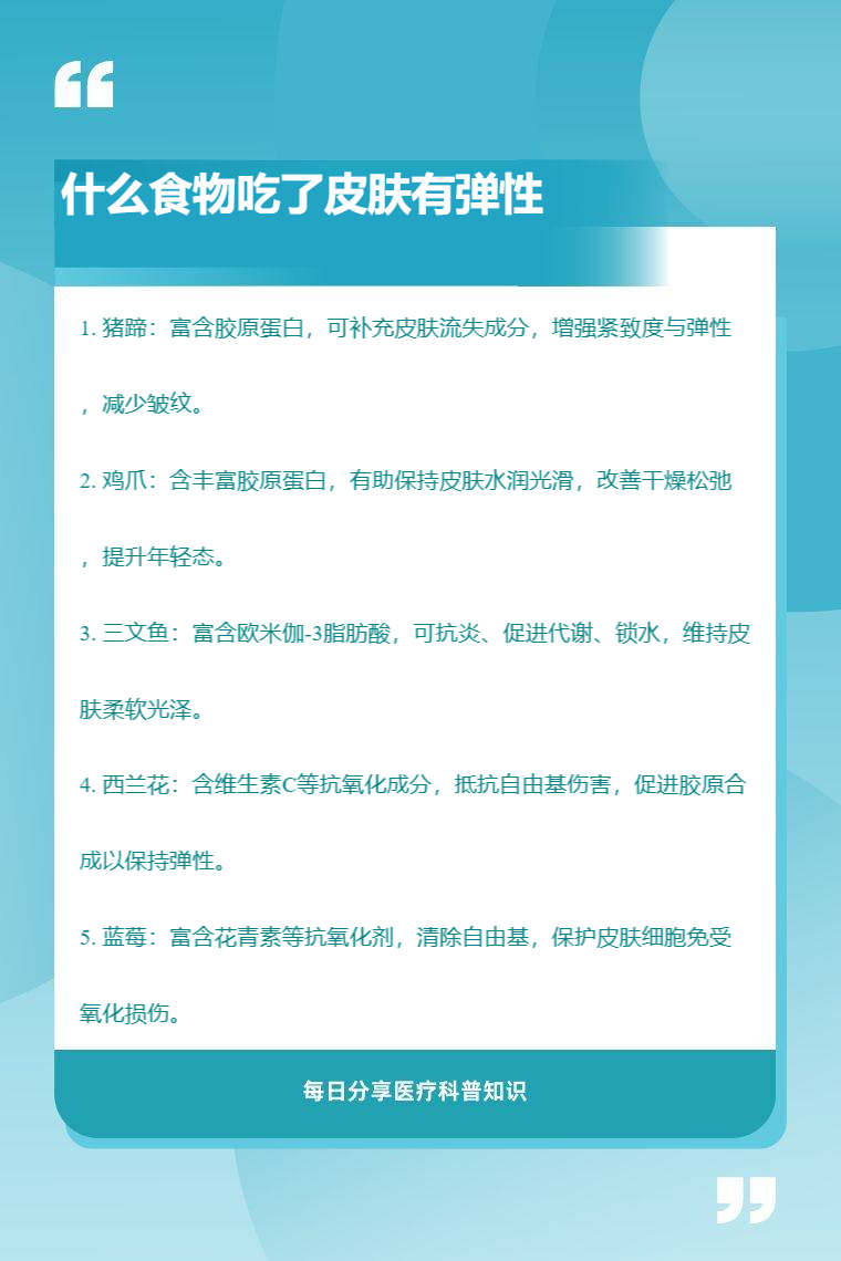 猪蹄、鸡爪、三文鱼、西兰花、蓝莓等食物吃了对皮肤有弹性有益。
