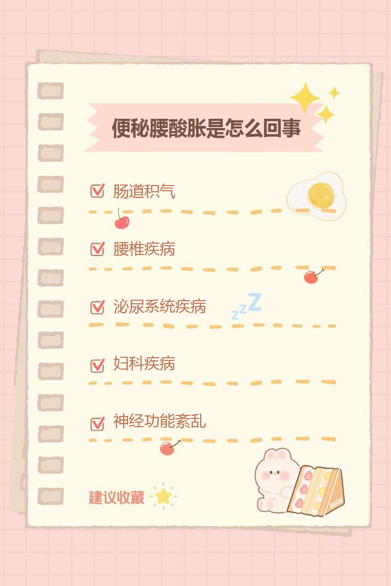 便秘腰酸胀可能由肠道积气、腰椎疾病、泌尿系统疾病、妇科疾病、神经功能紊乱等引起。
