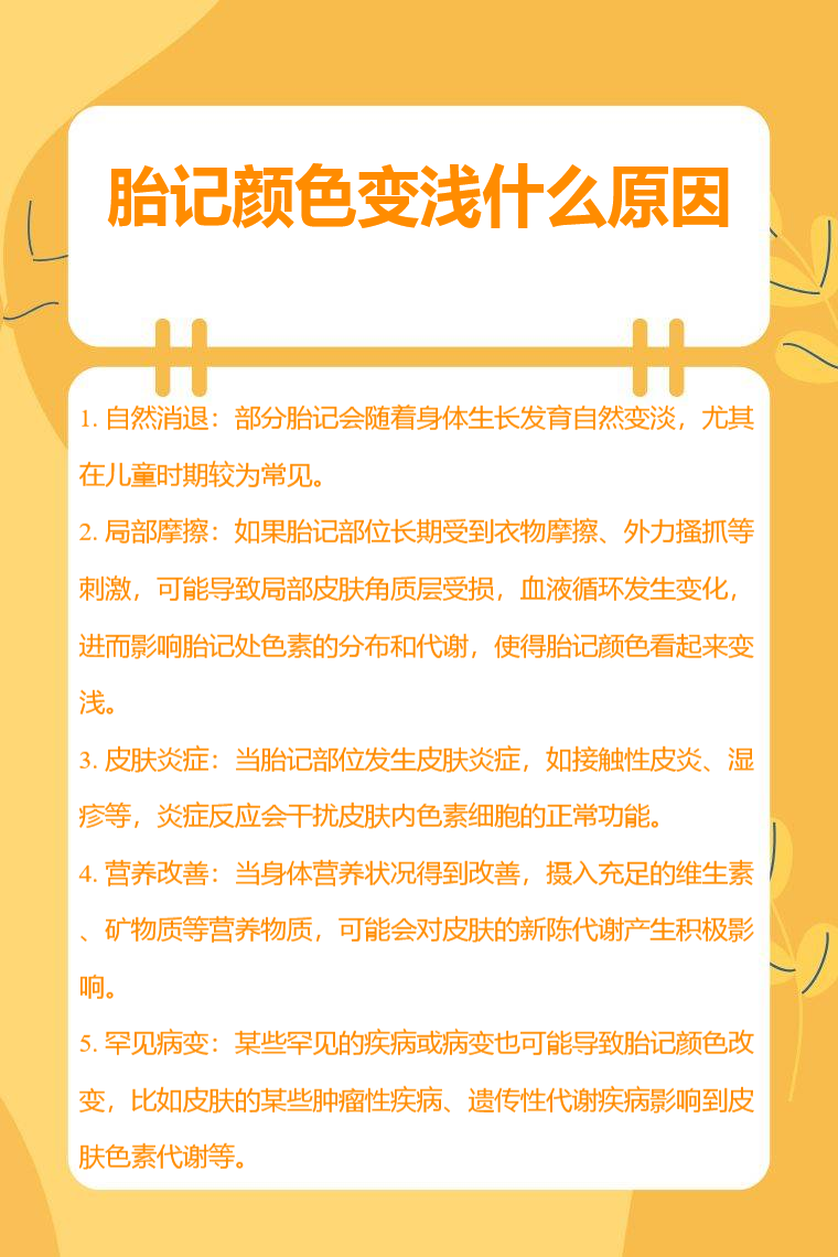 胎记颜色变浅可能是自然消退、局部摩擦、皮肤炎症、营养改善、罕见病变等原因。