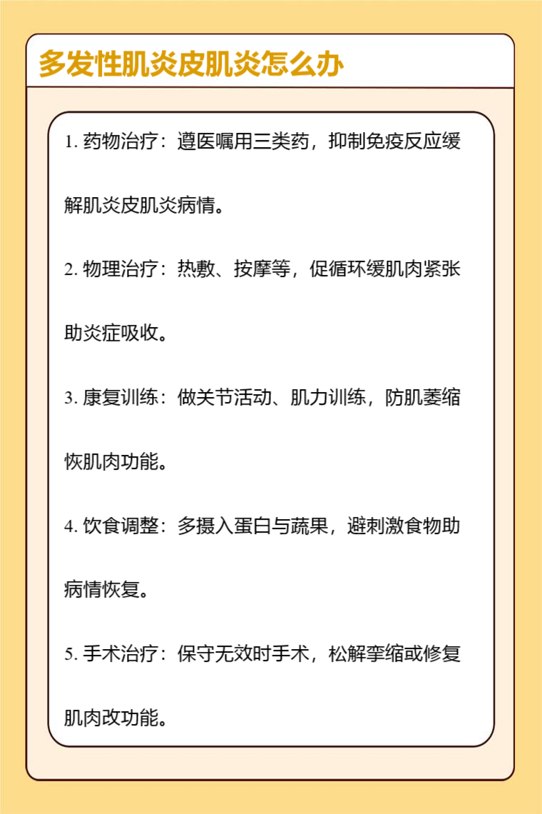 多发性肌炎皮肌炎可通过药物治疗、物理治疗、康复训练、饮食调整、手术治疗等方法应对。