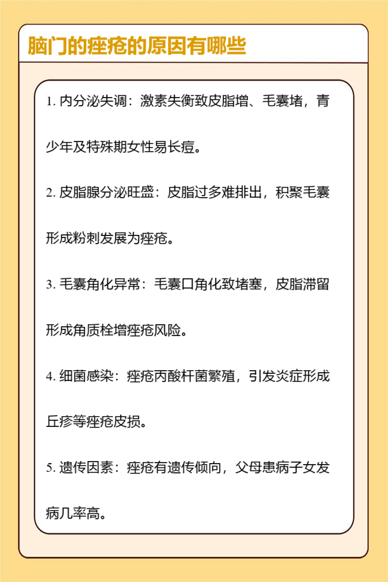 脑门出现痤疮的原因有内分泌失调、皮脂腺分泌旺盛、毛囊角化异常、细菌感染、遗传因素等。
