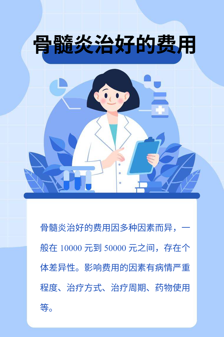 骨髓炎治好的费用因多种因素而异,一般在 10000 元到 50000 元之间,存在个体差异性。影响费用的因素有病情严重程度、治疗方式、治疗周期、药物使用 等。