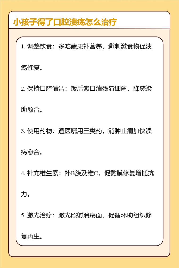 小孩子得了口腔溃疡可通过调整饮食、保持口腔清洁、使用药物、补充维生素、激光治疗等方法来治疗。