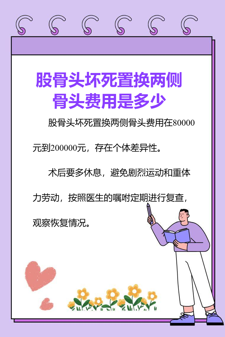 股骨头坏死置换两侧骨头费用在80000元到200000元,存在个体差异性。影响费用的因素有假体材料、手术难度、康复治疗、住院时间等。