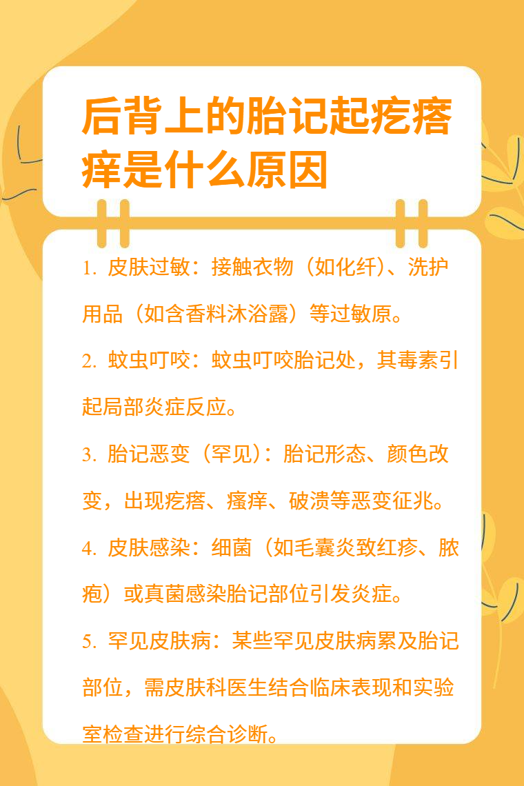 后背上胎记起疙瘩痒可能是由皮肤过敏、蚊虫叮咬、胎记恶变、皮肤感染、罕见皮肤病等原因引起。