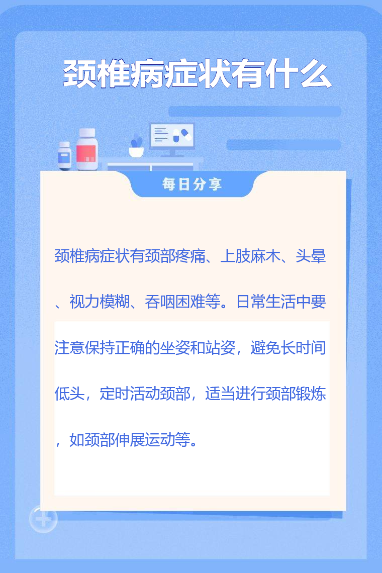日常生活中要注意保持正确的坐姿和站姿,避免长时间低头,定时活动颈部,适当进行颈部锻炼,如颈部伸展运动等。若出现上述症状,应及时就医,明确诊断后遵医嘱进行规范治疗。