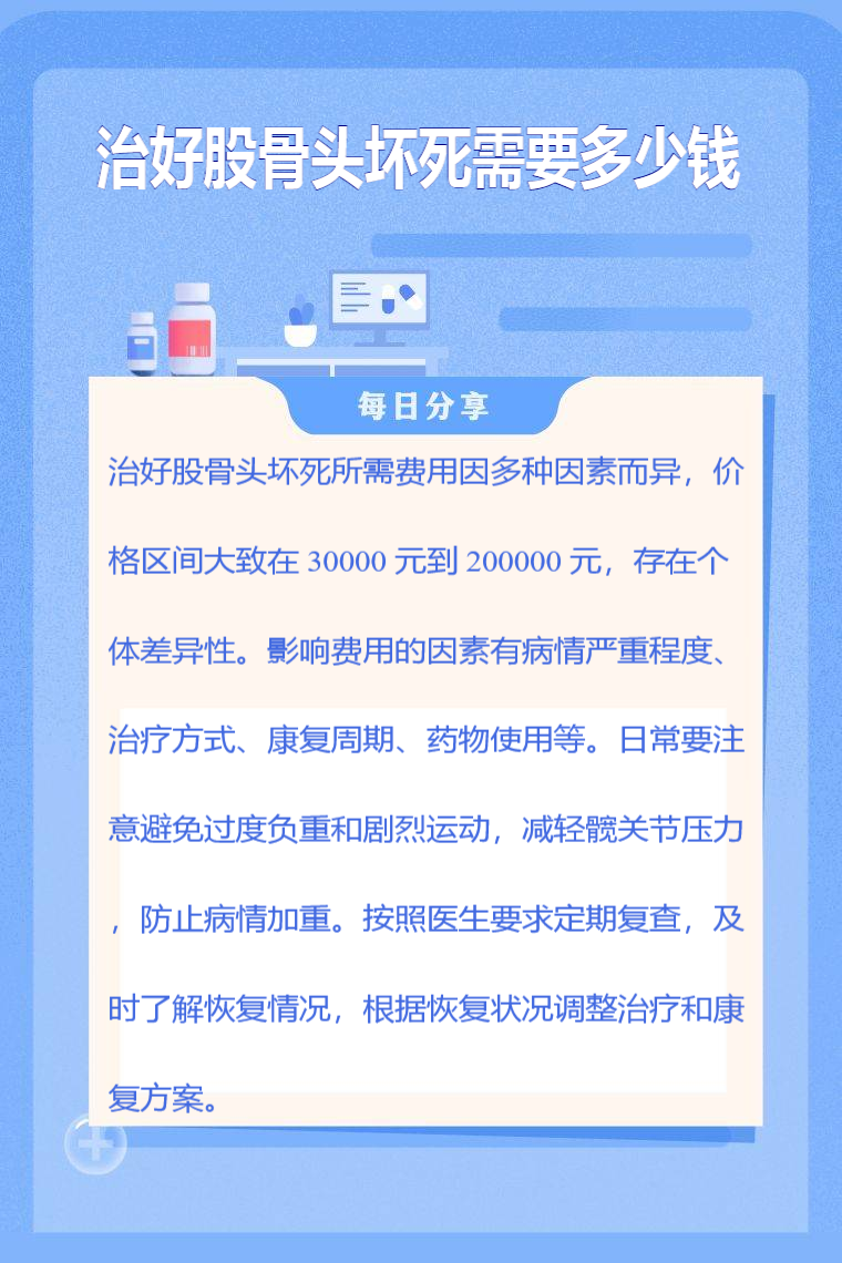治好股骨头坏死所需费用因多种因素而异,价格区间大致在 30000 元到 200000 元,存在个体差异性。影响费用的因素有病情严重程度、治疗方式、康复周期、药物使用等。