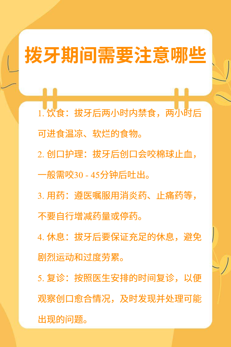 拔牙后要多留意自身情况,严格遵循上述注意事项。保持良好的生活习惯和口腔卫生,有助于创口更快更好地愈合。若在恢复过程中出现异常症状,如持续疼痛、肿胀加剧等,应立即前往医院就诊。