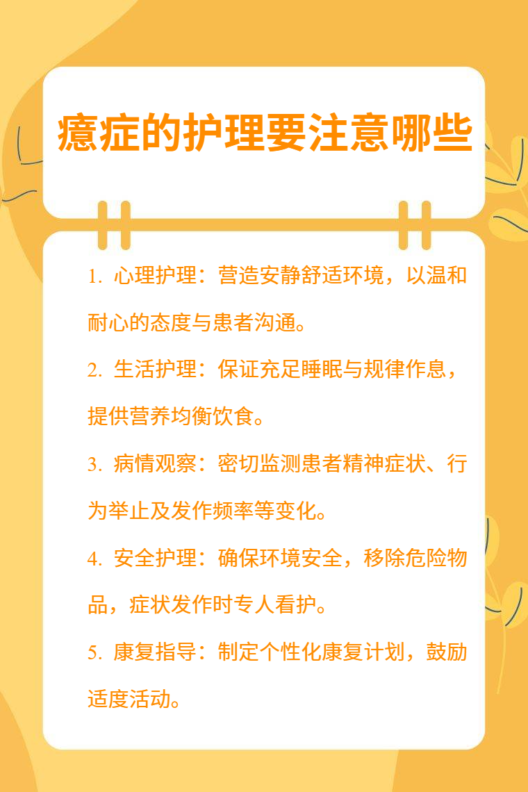 4. 安全护理:确保患者所处环境安全,移除可能导致伤害的物品。在患者症状发作时,守护在旁,防止其出现自伤、伤人等行为,必要时采取适当保护措施。
