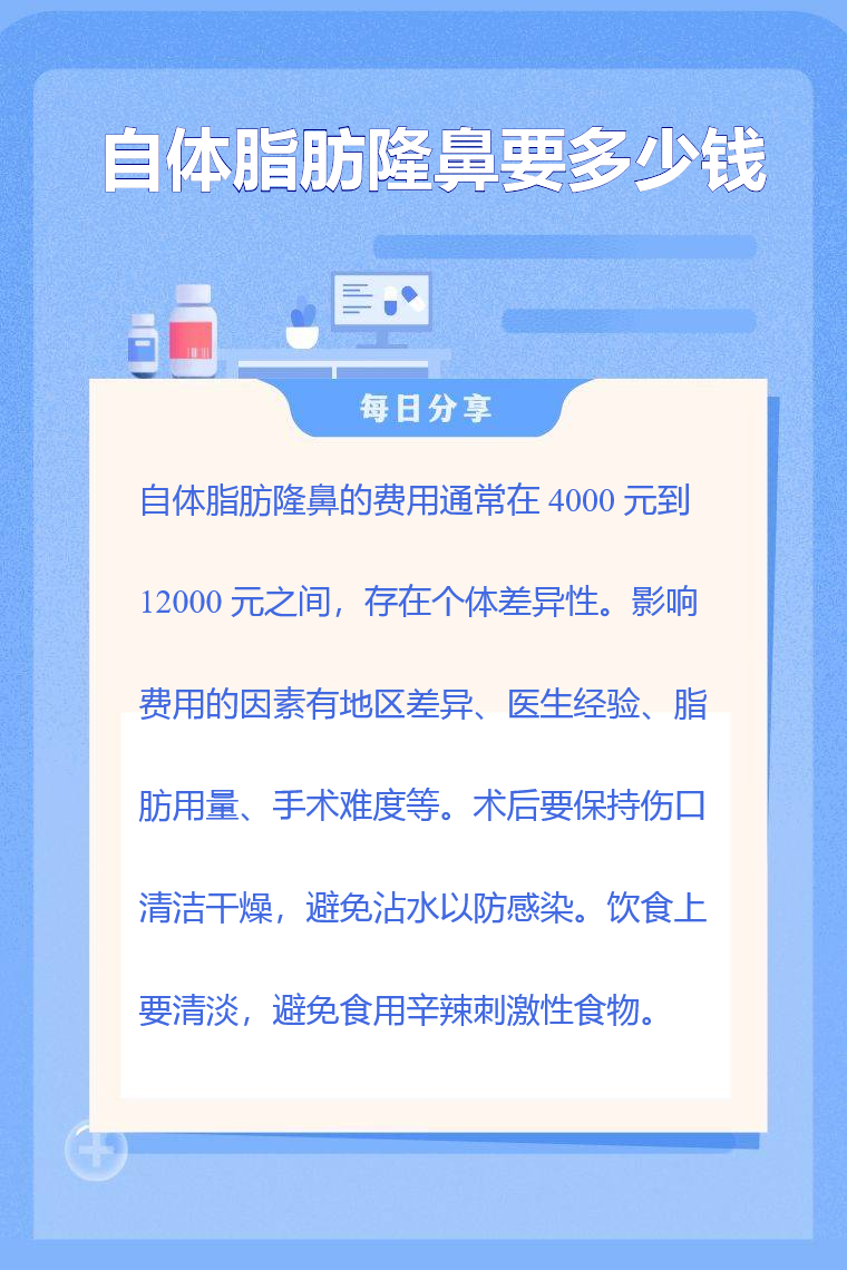 自体脂肪隆鼻的费用通常在 4000 元到 12000 元之间,存在个体差异性。影响费用的因素有地区差异、医生经验、脂肪用量、手术难度等。